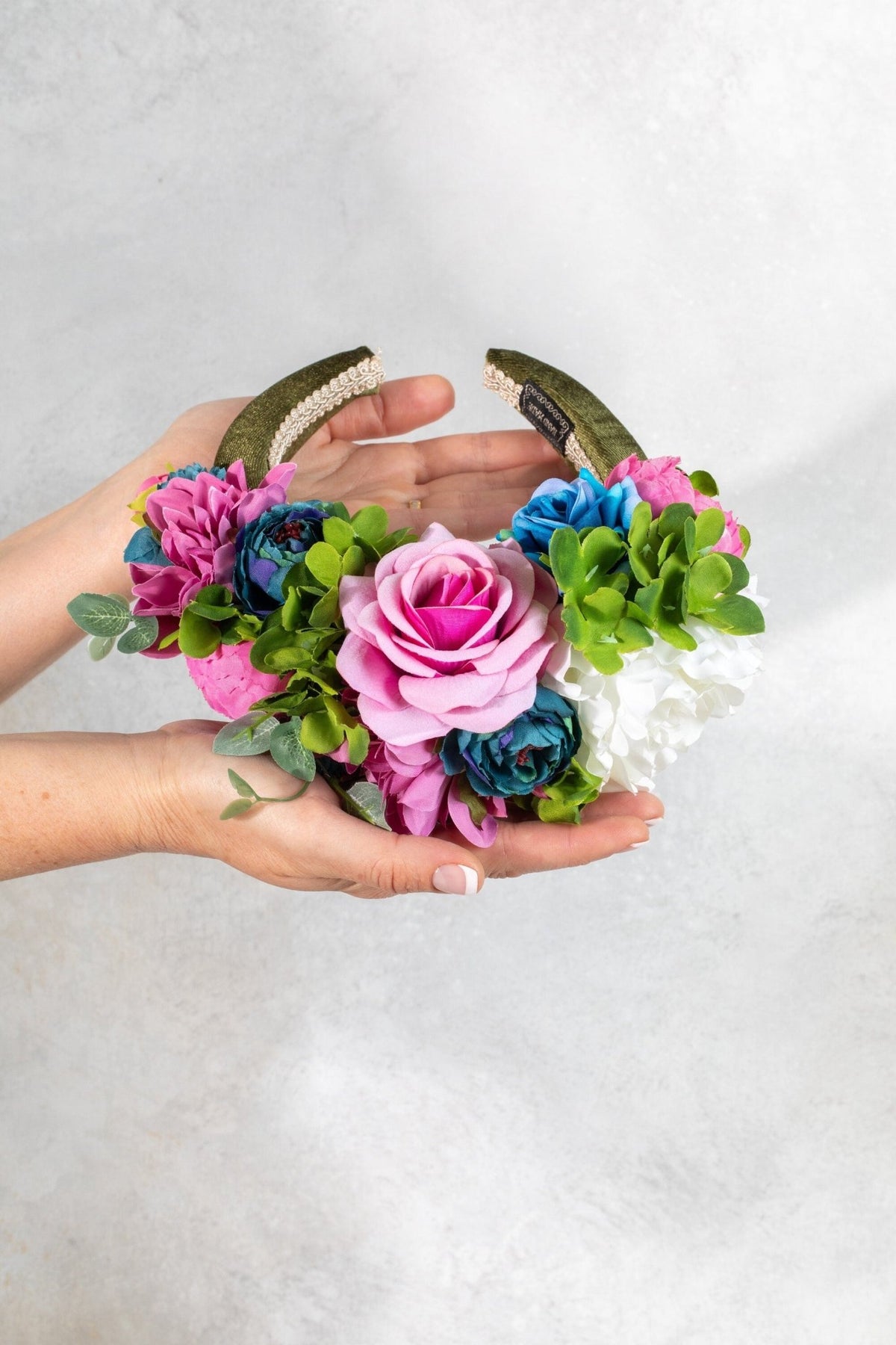 A vibrant multi-color flower padded fascinator headband designed to elevate wedding looks and special occasions. Featuring blooms in fuchsia, sage green, teal blue and pink, it brings a confident, modern floral statement.