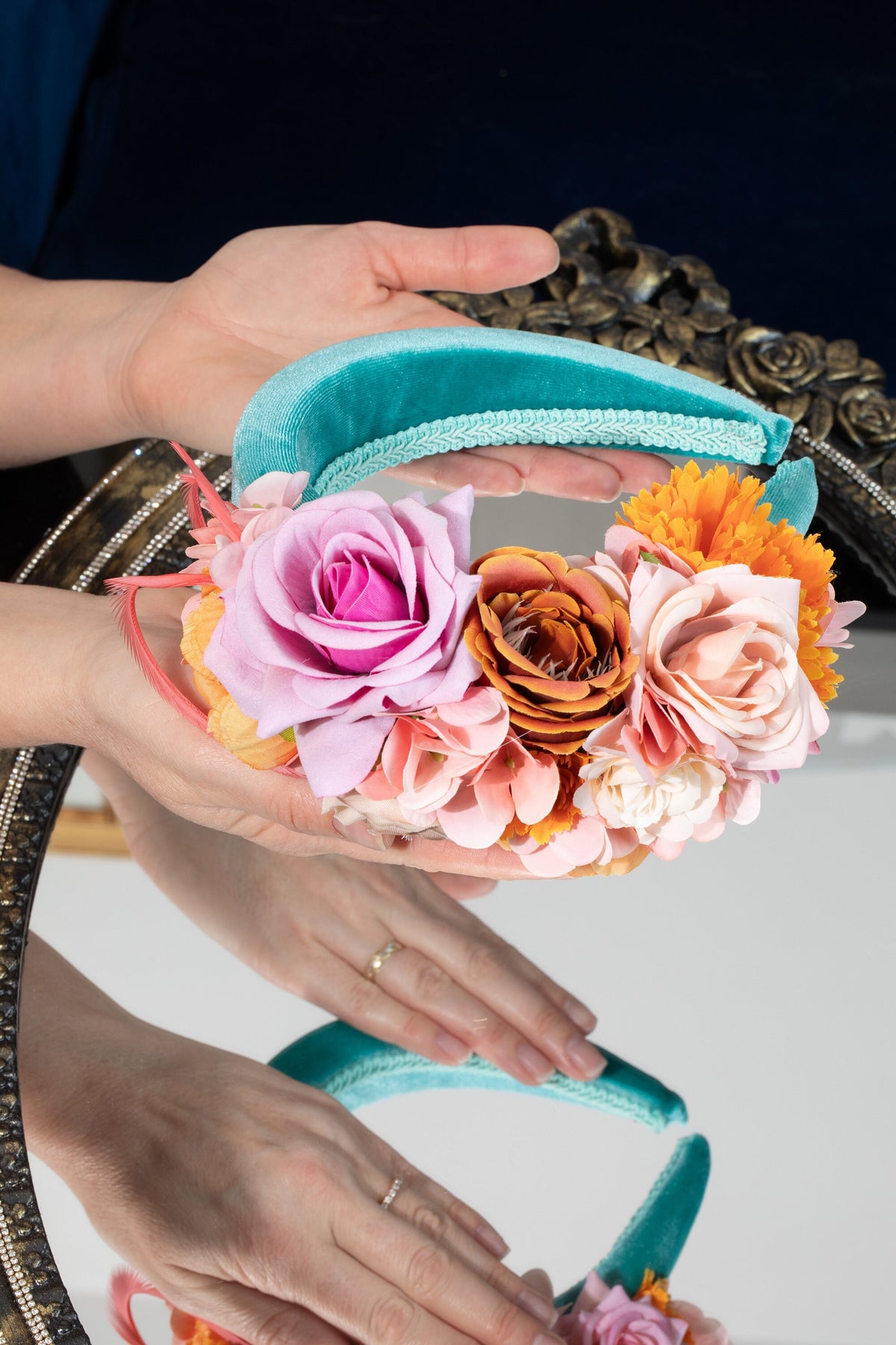 Mint green padded fascinator headband on a 4 cm padded plastic base wrapped in slightly satin velvet. Features a peach, blush pink, warm orange and cream floral composition with feathers. An eye-catching choice for weddings, garden parties and elegant events.